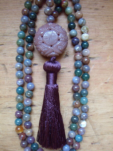 Mala Beads - A Mala (Sanskrit; mala, meaning garland) is a set of beads usually made from 108 beads. Malas Beads / Prayer Beads are mainly used to count mantras. These mantras can be recited for different purposes linked to working with the mind during meditation. Mani Mantra Mala's Mala/Prayer Beads are each one-of-a-kind and handmade from gemstones.
